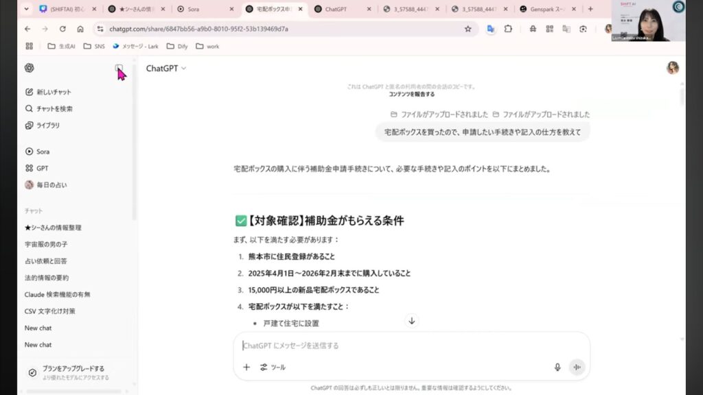 ウェビナーでは、行政の「宅配ボックス購入補助金」のチラシを撮影し、ChatGPTにアップロードする実演が行われました。