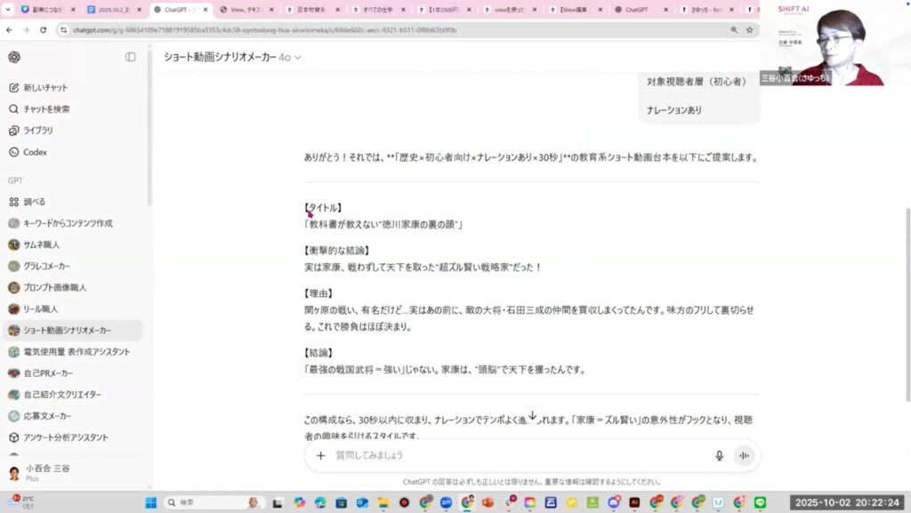 ウェビナーでは、講師が作成した専用のGPTsを使用し、「iPhoneの裏技」などのテーマを入力するだけで、タイトルや構成案が一瞬で出力される様子が実演されました。