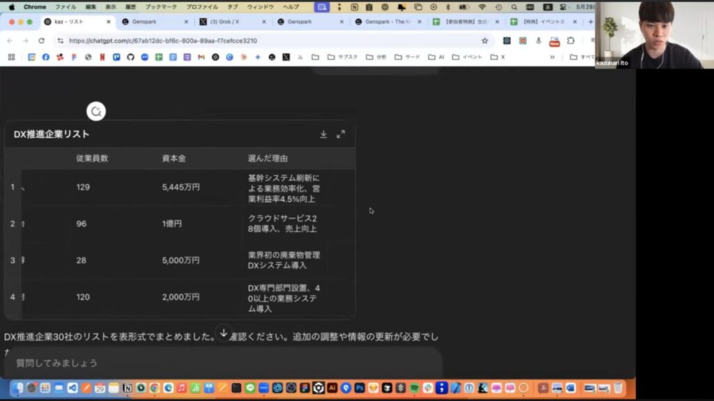 ウェビナーでは、GrokやChatGPTのディープリサーチ機能を使って企業情報を一括で調査する方法が紹介されました。