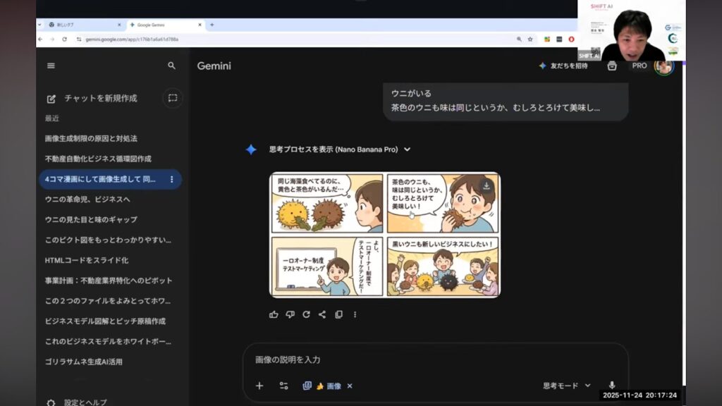 ウェビナーでは、「ウニの色の違いを説明する4コマ漫画」や「説明図解」を生成するデモが行われ、複雑な指示や文字入り画像も高品質に出力できる様子が紹介されました。